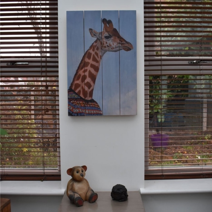I love giraffes. The Geoffrey composition was on of my first pieces after I left my job as a teacher. He came about because I was exploring how to make my work a little different and stand out. A friend popped in for coffee so I showed my just completed picture. She burst out laughing!! Luckily it was in a good way, something in my brain clicked, I wanted to make people happy with my art.