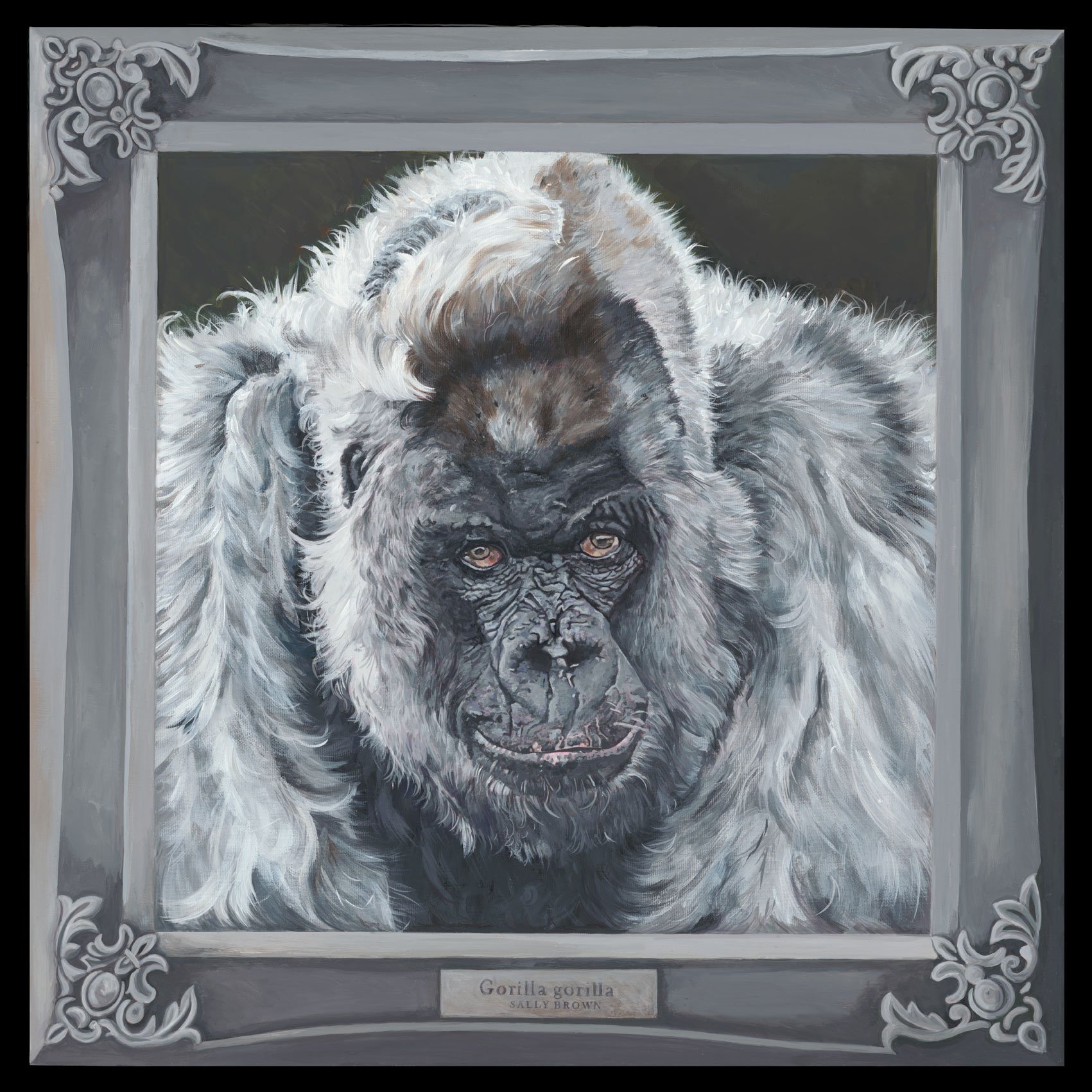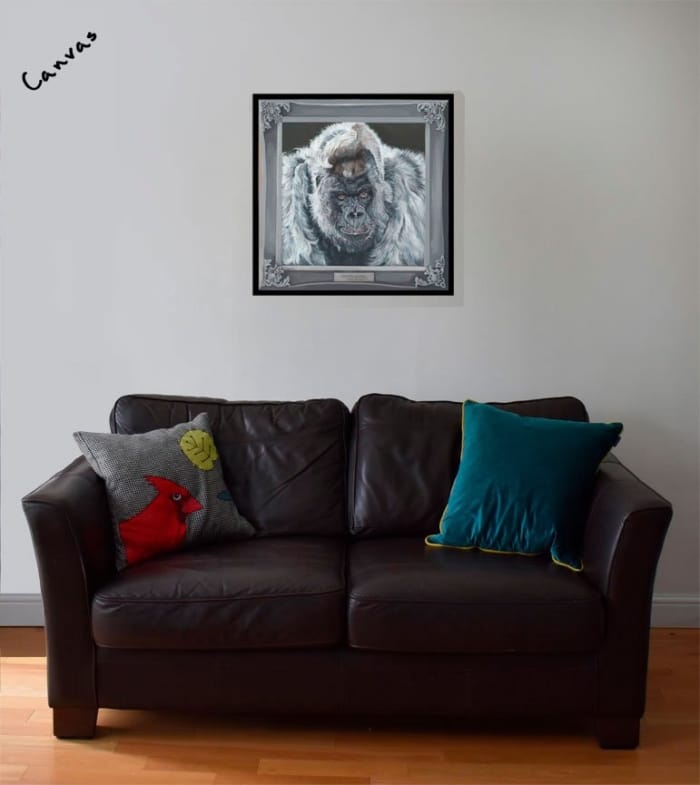 This painting is a portrait of Nico the gorilla who lived at Longleat Safari Park. I completed this painting as a tribute after he died. Luckily on a visit to Longleat I had managed to get an awesome photograph of him. When you look at his face, it makes you wonder what is he thinking. I completed the painting of his face and added a frame later.
